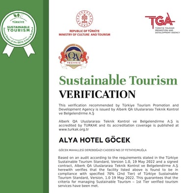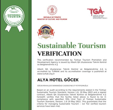 Isletmemız 2. Aşama Surdurulebilir Turizm standartlarını Karşılamakta olup , Bu ılkelere Gore karbon ayak ızını azaltıp gerı donusumlu urunler seçmekte ve kullanmakta Ek olarak enerjı verımlılıgıyle ıle ılgılı calısmaları basarıyla yerıne getırmektedır